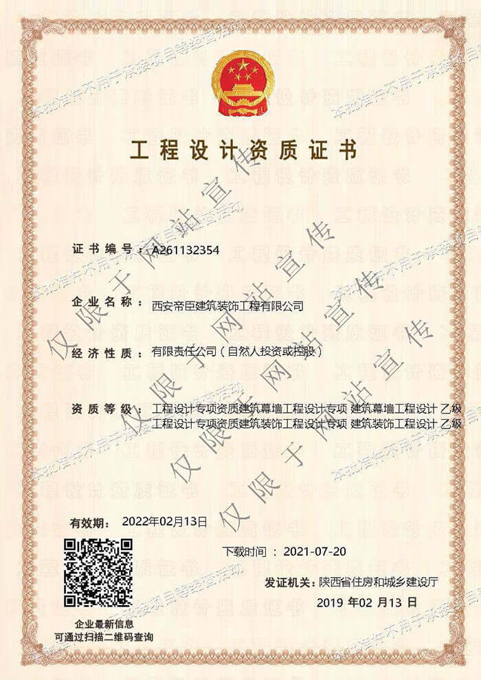公司成立以來已成為建設(shè)部核準(zhǔn)的建筑裝修裝飾工程專業(yè)承包 一級(jí)、防水防腐保溫工程專業(yè)承包 二級(jí)、建筑機(jī)電安裝工程專業(yè)承包 三級(jí)、鋼結(jié)構(gòu)工程專業(yè)承包 三級(jí)、建筑幕墻工程專業(yè)承包 二級(jí)、消防設(shè)施工程專業(yè)承包 二級(jí)、環(huán)保工程專業(yè)承包 三級(jí)、建筑工程施工總承包 三級(jí)、機(jī)電工程施工總承包 三級(jí)、工程設(shè)計(jì)專項(xiàng)資質(zhì)建筑幕墻工程設(shè)計(jì)專項(xiàng) 建筑幕墻工程設(shè)計(jì) 乙級(jí)、工程設(shè)計(jì)專項(xiàng)資質(zhì)建筑裝飾工程設(shè)計(jì)專項(xiàng) 建筑裝飾工程設(shè)計(jì) 乙級(jí)的裝飾企業(yè)……